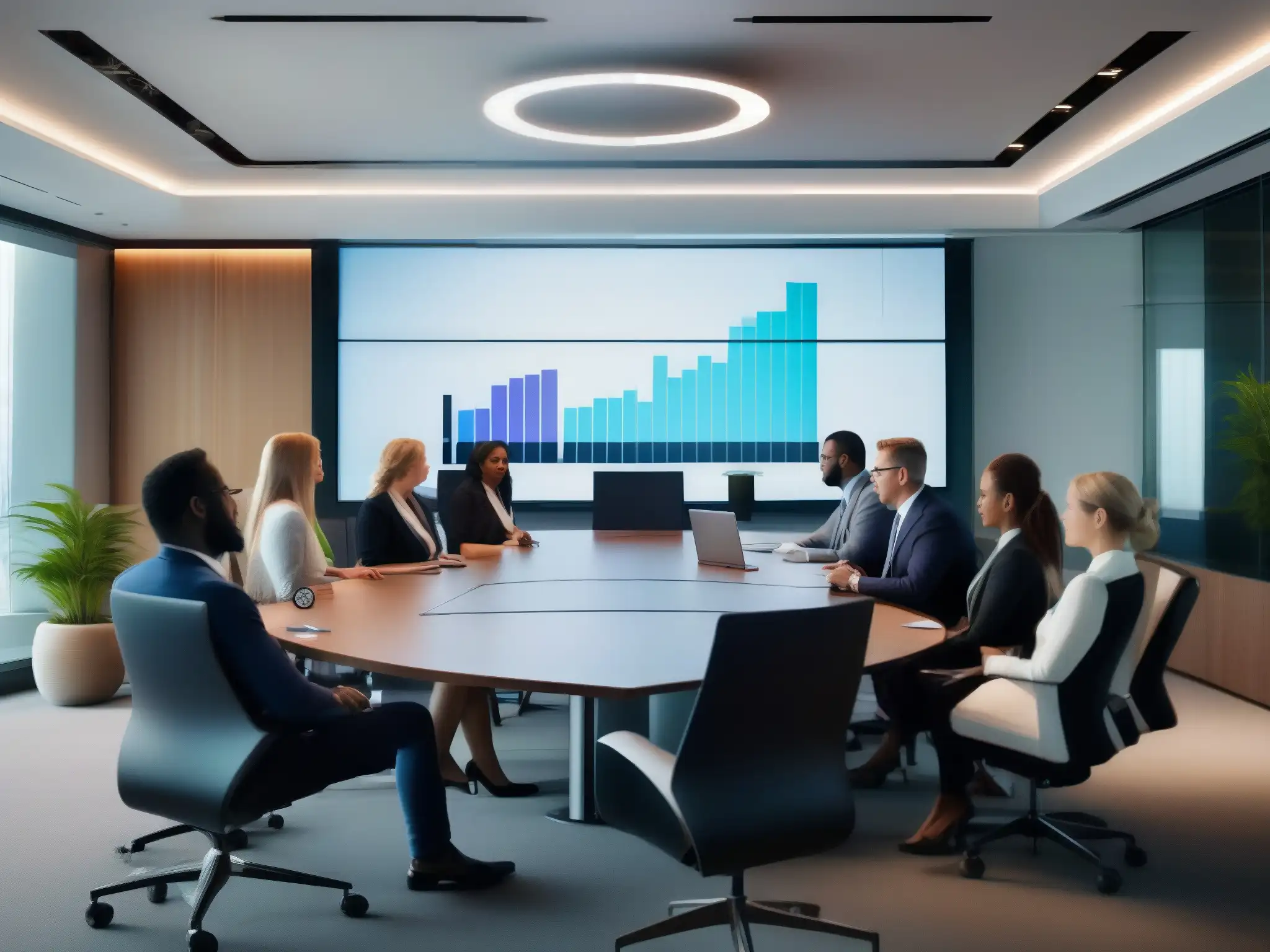 Una videoconferencia en el sector financiero, con profesionales comprometidos en una elegante sala de juntas con abundante luz natural